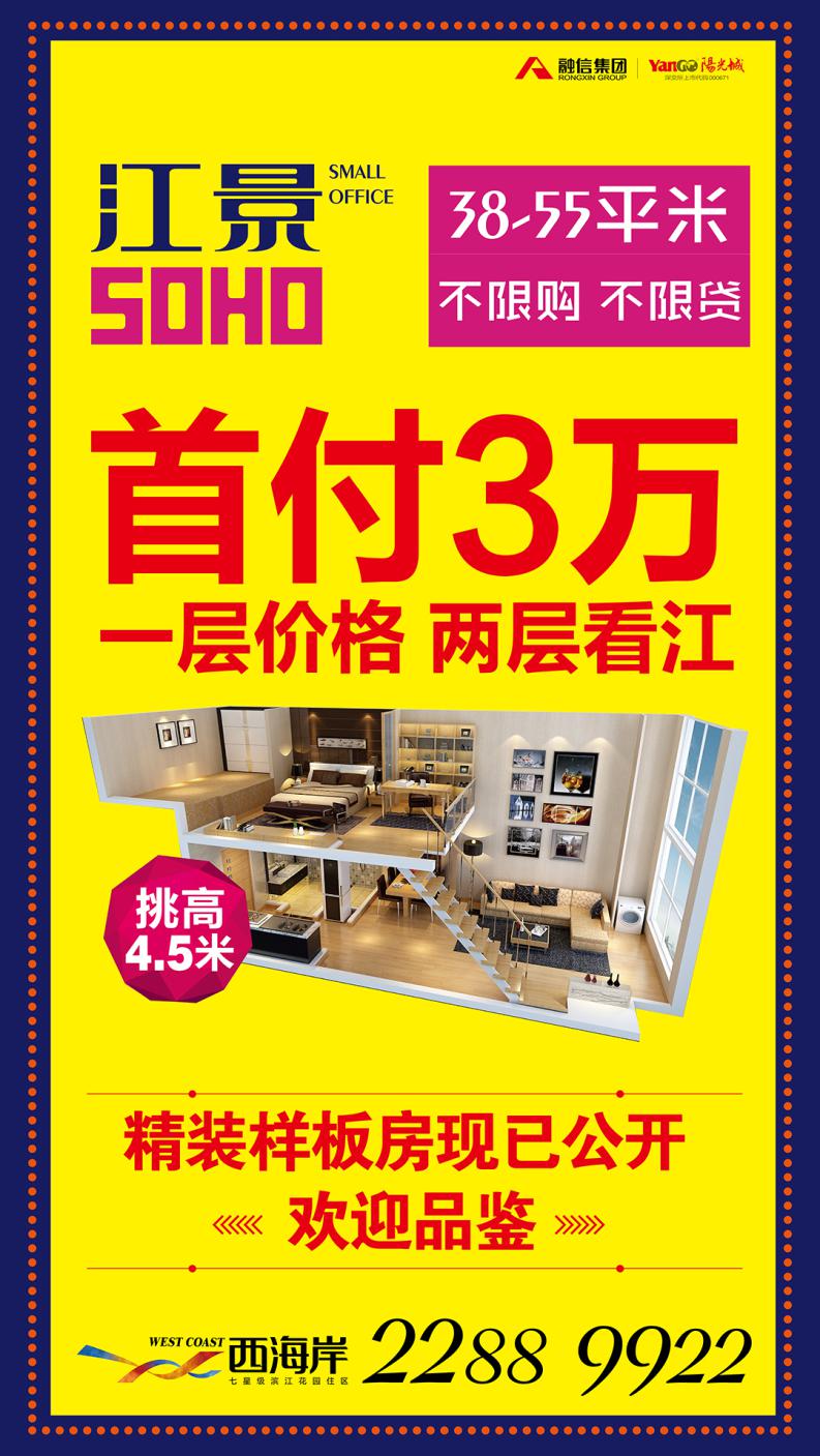 【江景】SOHO样板房和滨江广场示范区现已同步公开。首付3万抢38-53平SOHO,即享4.5米挑高超值空间,不限购不限贷,绝对超值,最后30套,限量放送!