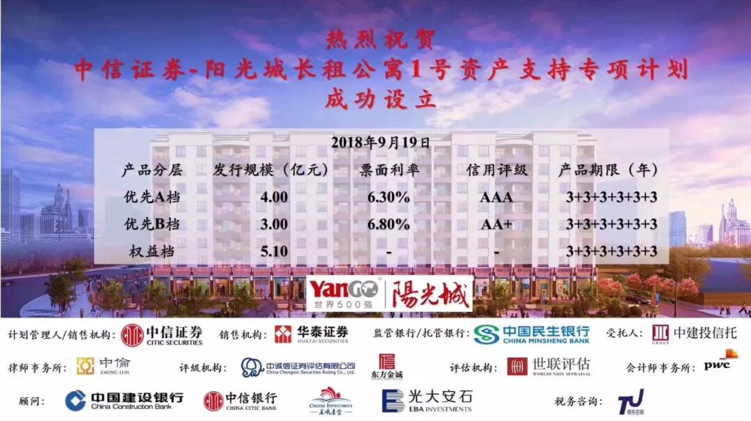 2018年9月19日,“中信证券-阳光城长租公寓1号资产支持专项计划”成功发行。本期计划总发行规模12.1亿元,其中A档票面利率6.30%。这是今年上半年阳光城获批深交所A股上市民营房企首单储架式长租REITs30亿额度后,按计划发行的首期REITs。