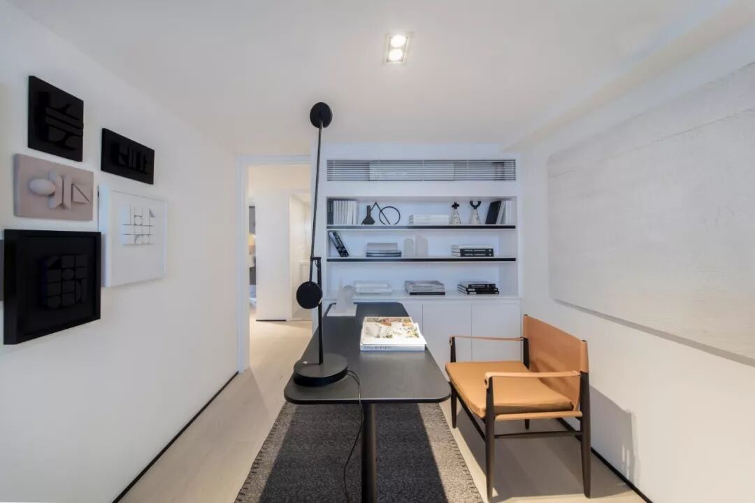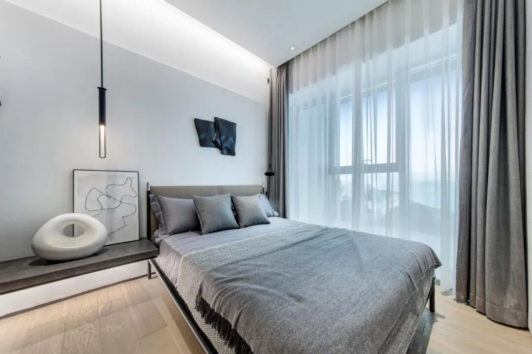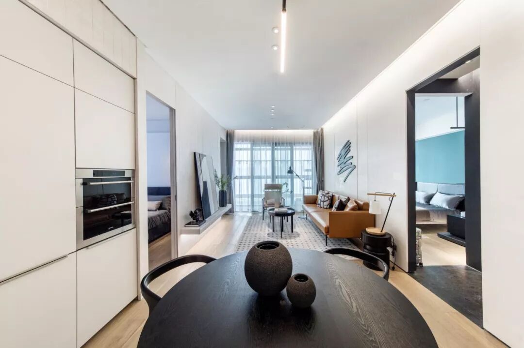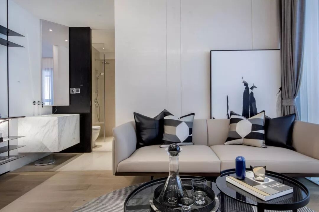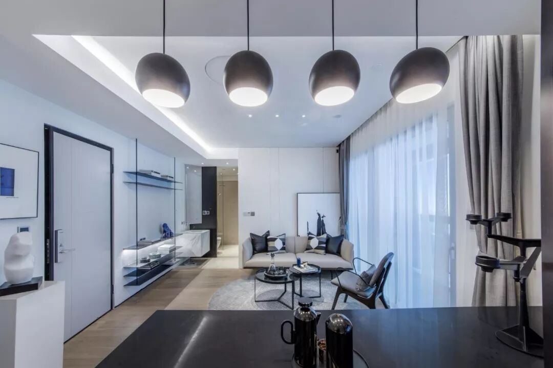天际公寓样板房的设计,用纯粹的几何块面和单色域构成具有深度的精神场域,精准的材料与净化的线条是建立样板房器度的准则。黑白灰三色搭配、简约线条构筑的空间、精选的灯饰,赋予空间更高级的神韵。