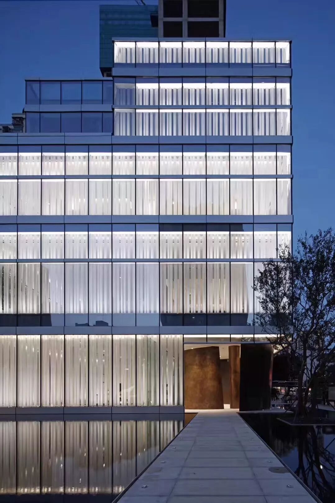 艺廊前广场大面积的水景,反射天空的颜色,在视觉的延展中,传达出天、地、人的广阔与灵性,建筑的观感得以更加意味深长。“行走的人”雕塑与洁白钢琴点缀其间,一条小道蜿蜒水景中,形成一幅城市现代水景画,营造出独特的场域感、仪式感以及含蓄美。这或许是极简美学所承载的巨大力量:看似孱弱,但却蕴含了巨大的精神力量 。