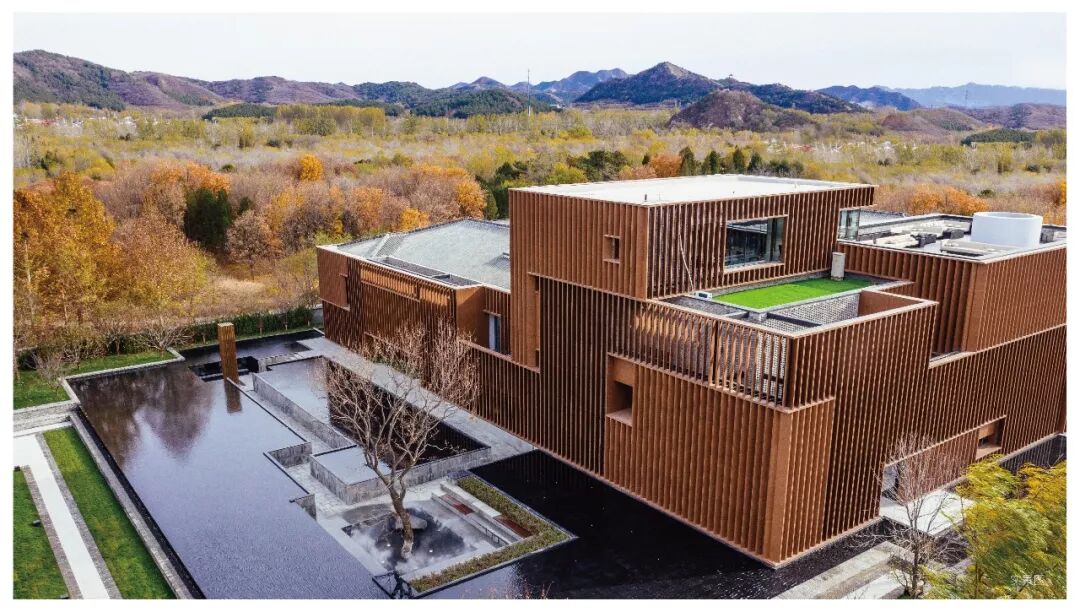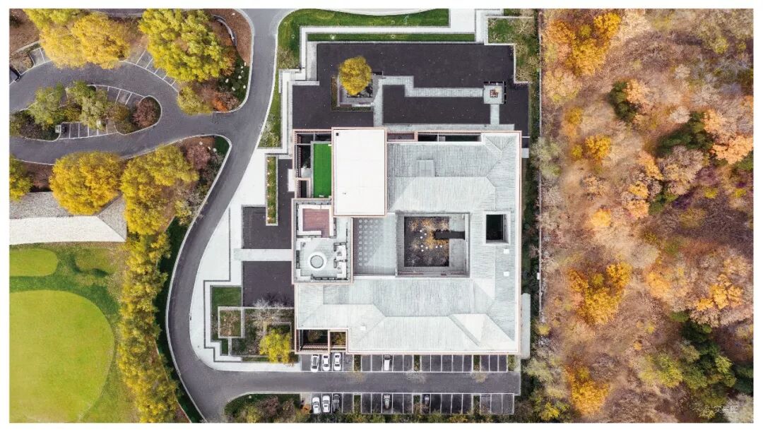 从三楼露台俯瞰美学馆,是经典回字形建筑。绿林成荫,自然山水蜿蜒而过。四面环廊,中间看景,有四合院的古典,也有现代的时尚。