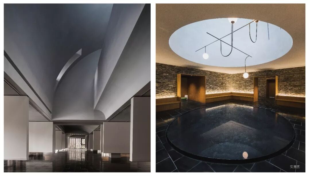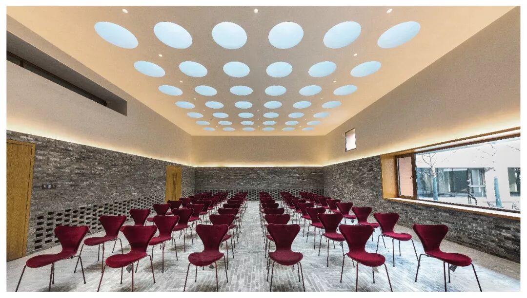 除此之外,多种空间节点设计亦彰显设计师独到的审美意向:一入大门就可一窥全貌的“天空之境”,圆形水面宛如一面镜子,通过正上方挂贯穿整个美学馆的圆形天窗,光线将直接倒映在水面上,使观者不抬头便能看到自然光的倒影;颇有美感的多功能厅,顶部在屋面预制圆柱形采光天窗54个,形成有韵律的天花图案,保证光线均匀漫射,利用自然光,打破建筑与自然的边界。