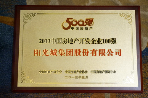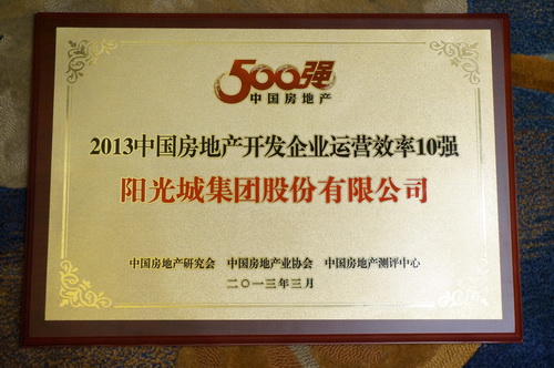 3月22日,2013年 "中国房地产开发企业500强测评成果"发布会在京举行。阳光城集团跻身“2013中国房地产百强企业”,并在“运营效率10强”榜中排名第二。“中国房地产开发企业500强测评”由中国房地产研究会、中国房地产业协会联合中国房地产测评中心主办。作为行业测评研究的重要指标之一,中国房地产“开发企业及首选品牌500强”评选已经开展了近五年,并在业界引起了良好的反响。其研究已成为评判房地产企业经营实力及行业地位的风向标。