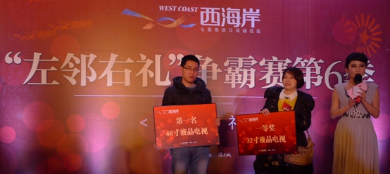 争霸赛上,主持人现场清点老客户推荐新客户成交套数和金额,并评出一二三名,现场给予彩电、冰箱、洗衣机等超值大奖。争霸赛第一名,他介绍了12套,获得了46寸大彩电。